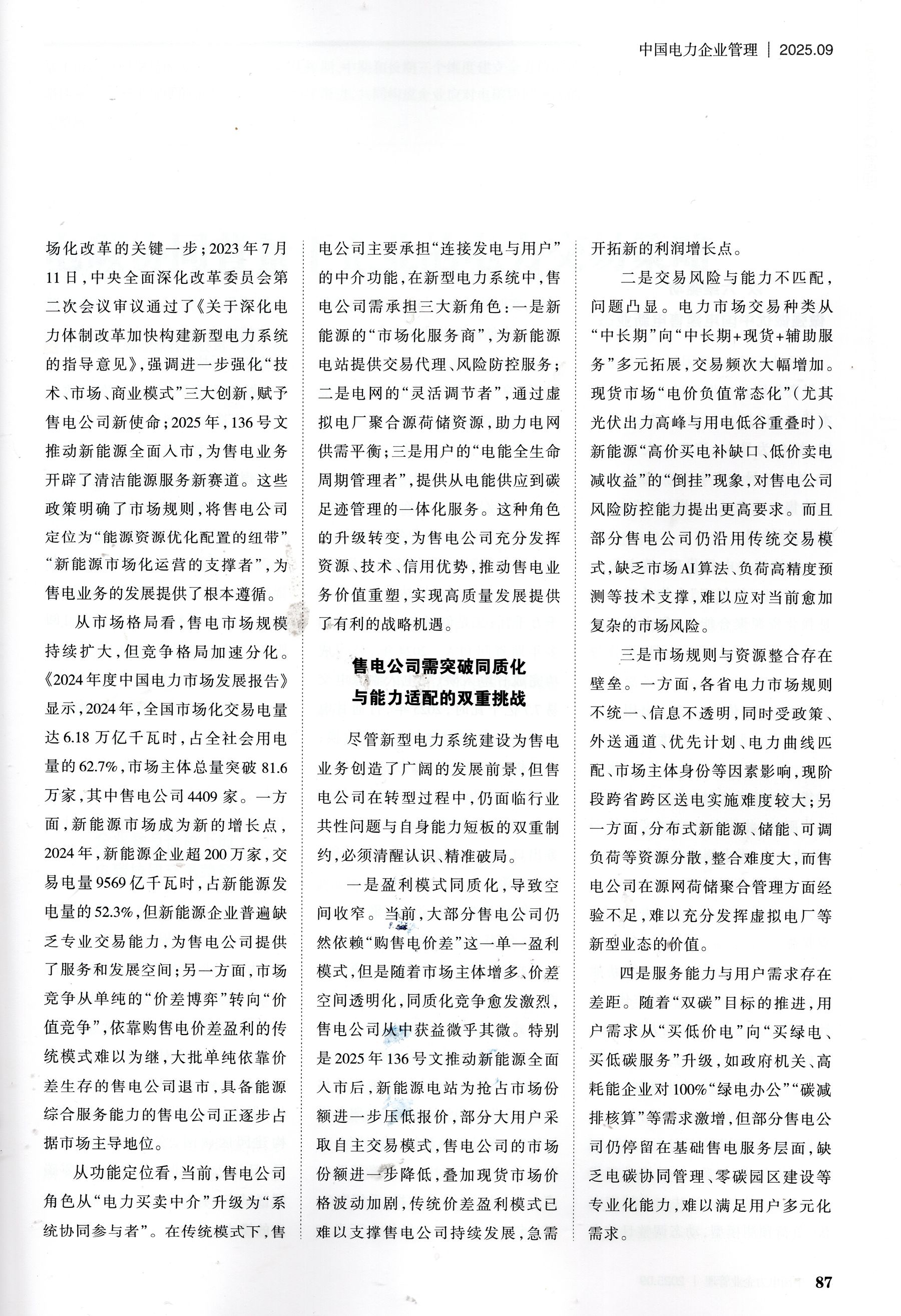 在我国能源革命与电力体制改革深度融合的当下,“双碳”目标引领新型电力系统建设正在加速推进,售电业务作为电力市场化改革的关键一环,正经历从“量变”到“质变”的深刻变革。作为服务国家能源战略的国有电力能源投资企业,中电建电力投资集团公司始终精准把握形势、直面发展困境、找准突破路径,重塑售电业务服务价值,为新型电力系统建设提供坚实支撑。 一、售电业务正处于战略机遇与变革重塑的关键期 新型电力系统的构建为售电业务开拓了全新发展空间。政策导向,市场格局、功能定位的三重变革,正促使售电公司从单纯的“电力中介”向“综合能源服务商”加速转型,进入靠服务创造价值的“微利时代”。 从政策导向看,国家支持新型电力系统与售电业务协同发展的政策体系已具雏形,并在持续优化完善。2021年中央财经委员会第九次会议首次提出“构建以新能源为主体的新型电力系统”,明确了售电业务转型方向;同年,1439号文推动燃煤发电全面入市、取消工商业目录电价,成为电力市场化改革的关键一步;2023年,《关于深化电力体制改革加快构建新型电力系统的指导意见》,强调进一步强化“技术、市场、商业模式”三大创新,赋予售电公司新使命;2025年,136号文推动新能源全面入市,为售电业务开辟了清洁能源服务新赛道。这些政策明确了市场规则,将售电公司定位为“能源资源优化配置的纽带”“新能源市场化运营的支撑者”,为售电业务的发展提供了根本遵循。 从市场格局看,售电市场规模持续扩大,但竞争格局加速分化。《2024年度中国电力市场发展报告》显示,2024年全国市场化交易电量达6.18万亿千瓦时,占全社会用电量的62.7%,市场主体总量突破81.6万家,其中售电公司4409家。一方面,新能源市场成为新增长点,2024年新能源企业超200万家,交易电量9569亿千瓦时,占新能源发电量的52.3%,但新能源企业普遍缺乏专业交易能力,为售电公司提供了服务和发展空间;另一方面,市场竞争从单纯的“价差博弈”,转向“价值竞争”,2015年—2021年期间依靠购售电价差盈利的传统模式逐渐难以为继,大批单纯依靠价差生存的售电公司退市,具备能源综合服务能力的售电公司正逐步占据市场主导地位。 从功能定位看,当前售电公司角色从“电力买卖中介”升级为“系统协同参与者”。在传统模式下,售电公司主要承担“连接发电与用户”的中介功能,在新型电力系统中,售电公司需承担三大新角色:一是新能源的“市场化服务商”,为新能源电站提供交易代理、风险防控服务;二是电网的“灵活调节者”,通过虚拟电厂聚合源荷储资源,助力电网供需平衡;三是用户的“电能全生命周期管理者”,提供从电能供应到碳足迹管理的一体化服务。这种角色升级转变,为售电公司充分发挥资源、技术、信用优势,推动售电业务价值重塑,实现高质量发展提供了有利的战略机遇。 二、售电公司需突破同质化与能力适配的双重挑战 尽管新型电力系统建设为售电业务创造了广阔的发展前景,但售电公司在转型过程中,仍面临行业共性问题与自身能力短板的双重制约,我们必须清醒认识、精准破局。 一是盈利模式同质化,导致空间收窄。当前,大部分售电公司仍然依赖“购售电价差”这一单一盈利模式,但是随着市场主体增多、价差空间透明化,同质化竞争愈发激烈,售电公司从中获益微乎其微。特别是2025年136号文推动新能源全面入市后,新能源电站为抢占市场份额进一步压低报价,部分大用户采取自主交易模式,导致售电公司市场份额进一步降低,叠加现货市场价格波动加剧,传统价差盈利模式已难以支撑售电公司持续发展,急需开拓新的利润增长点。 二是交易风险与能力不匹配,问题凸显。电力市场交易种类从“中长期”,向“中长期+现货+辅助服务”多元拓展,交易频次大幅增加。现货市场“电价负值常态化”(尤其光伏出力高峰与用电低谷重叠时)、新能源“高价买电补缺口、低价卖电减收益”的倒挂现象,对售电公司风险防控能力提出更高要求。而且部分售电公司仍沿用传统交易模式,缺乏市场AI算法、负荷高精度预测等技术支撑,难以应对当前愈加复杂市场风险。 三是市场规则与资源整合存在壁垒。一方面,各省电力市场规则不统一、信息不透明,同时受政策、外送通道、优先计划、电力曲线匹配、市场主体身份等因素影响,现阶段跨省区送电实施难度较大;另一方面,分布式新能源、储能、可调负荷等资源分散,整合难度大,而售电公司在“源网荷储”聚合管理方面经验不足,成熟度还有待进一步提升,难以充分发挥虚拟电厂等新型业态的价值。 四是服务能力与用户需求存在差距。随着“双碳”目标推进,用户需求从“买低价电”,向“买绿电、买低碳服务”升级,如政府机关、高耗能企业对100%绿电办公”“碳减排核算”等需求激增,但部分售电公司仍停留在基础售电服务层面,缺乏能碳协同管理、零碳园区建设等专业化能力,难以满足用户多元化需求。 三、以“六维驱动”做强做优中国电建售电新业态 面对新形势、新困局,中电建电力投资集团公司将积极发挥国有资本优势,以用户为中心、技术为支撑、绿色为导向,聚焦六大业务方向,构建差异化竞争优势,推动中国电建售电业务从“规模扩张”向“质量效益”转型。 做精用户电量代理,筑牢服务根基,打造