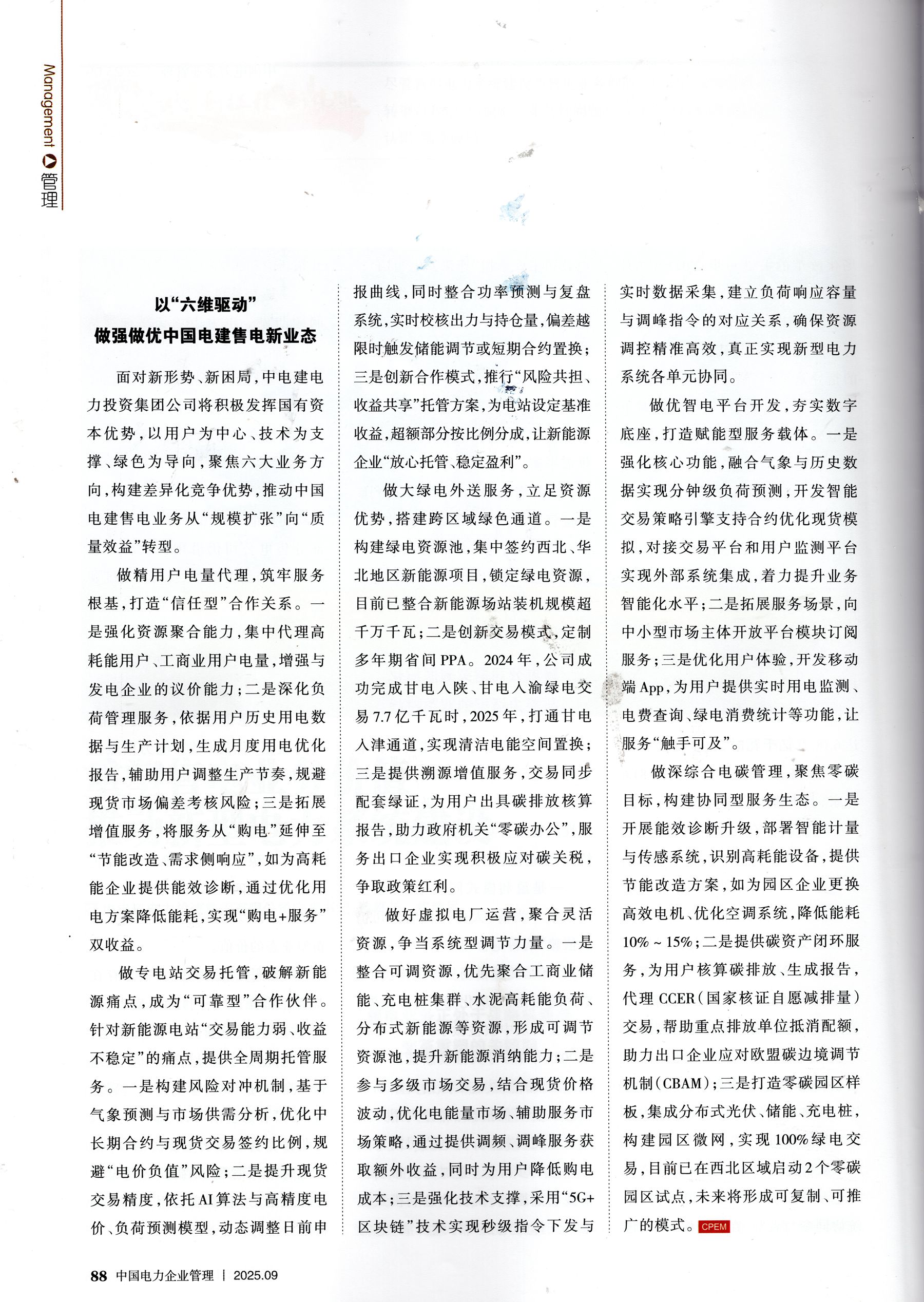 在我国能源革命与电力体制改革深度融合的当下,“双碳”目标引领新型电力系统建设正在加速推进,售电业务作为电力市场化改革的关键一环,正经历从“量变”到“质变”的深刻变革。作为服务国家能源战略的国有电力能源投资企业,中电建电力投资集团公司始终精准把握形势、直面发展困境、找准突破路径,重塑售电业务服务价值,为新型电力系统建设提供坚实支撑。 一、售电业务正处于战略机遇与变革重塑的关键期 新型电力系统的构建为售电业务开拓了全新发展空间。政策导向,市场格局、功能定位的三重变革,正促使售电公司从单纯的“电力中介”向“综合能源服务商”加速转型,进入靠服务创造价值的“微利时代”。 从政策导向看,国家支持新型电力系统与售电业务协同发展的政策体系已具雏形,并在持续优化完善。2021年中央财经委员会第九次会议首次提出“构建以新能源为主体的新型电力系统”,明确了售电业务转型方向;同年,1439号文推动燃煤发电全面入市、取消工商业目录电价,成为电力市场化改革的关键一步;2023年,《关于深化电力体制改革加快构建新型电力系统的指导意见》,强调进一步强化“技术、市场、商业模式”三大创新,赋予售电公司新使命;2025年,136号文推动新能源全面入市,为售电业务开辟了清洁能源服务新赛道。这些政策明确了市场规则,将售电公司定位为“能源资源优化配置的纽带”“新能源市场化运营的支撑者”,为售电业务的发展提供了根本遵循。 从市场格局看,售电市场规模持续扩大,但竞争格局加速分化。《2024年度中国电力市场发展报告》显示,2024年全国市场化交易电量达6.18万亿千瓦时,占全社会用电量的62.7%,市场主体总量突破81.6万家,其中售电公司4409家。一方面,新能源市场成为新增长点,2024年新能源企业超200万家,交易电量9569亿千瓦时,占新能源发电量的52.3%,但新能源企业普遍缺乏专业交易能力,为售电公司提供了服务和发展空间;另一方面,市场竞争从单纯的“价差博弈”,转向“价值竞争”,2015年—2021年期间依靠购售电价差盈利的传统模式逐渐难以为继,大批单纯依靠价差生存的售电公司退市,具备能源综合服务能力的售电公司正逐步占据市场主导地位。 从功能定位看,当前售电公司角色从“电力买卖中介”升级为“系统协同参与者”。在传统模式下,售电公司主要承担“连接发电与用户”的中介功能,在新型电力系统中,售电公司需承担三大新角色:一是新能源的“市场化服务商”,为新能源电站提供交易代理、风险防控服务;二是电网的“灵活调节者”,通过虚拟电厂聚合源荷储资源,助力电网供需平衡;三是用户的“电能全生命周期管理者”,提供从电能供应到碳足迹管理的一体化服务。这种角色升级转变,为售电公司充分发挥资源、技术、信用优势,推动售电业务价值重塑,实现高质量发展提供了有利的战略机遇。 二、售电公司需突破同质化与能力适配的双重挑战 尽管新型电力系统建设为售电业务创造了广阔的发展前景,但售电公司在转型过程中,仍面临行业共性问题与自身能力短板的双重制约,我们必须清醒认识、精准破局。 一是盈利模式同质化,导致空间收窄。当前,大部分售电公司仍然依赖“购售电价差”这一单一盈利模式,但是随着市场主体增多、价差空间透明化,同质化竞争愈发激烈,售电公司从中获益微乎其微。特别是2025年136号文推动新能源全面入市后,新能源电站为抢占市场份额进一步压低报价,部分大用户采取自主交易模式,导致售电公司市场份额进一步降低,叠加现货市场价格波动加剧,传统价差盈利模式已难以支撑售电公司持续发展,急需开拓新的利润增长点。 二是交易风险与能力不匹配,问题凸显。电力市场交易种类从“中长期”,向“中长期+现货+辅助服务”多元拓展,交易频次大幅增加。现货市场“电价负值常态化”(尤其光伏出力高峰与用电低谷重叠时)、新能源“高价买电补缺口、低价卖电减收益”的倒挂现象,对售电公司风险防控能力提出更高要求。而且部分售电公司仍沿用传统交易模式,缺乏市场AI算法、负荷高精度预测等技术支撑,难以应对当前愈加复杂市场风险。 三是市场规则与资源整合存在壁垒。一方面,各省电力市场规则不统一、信息不透明,同时受政策、外送通道、优先计划、电力曲线匹配、市场主体身份等因素影响,现阶段跨省区送电实施难度较大;另一方面,分布式新能源、储能、可调负荷等资源分散,整合难度大,而售电公司在“源网荷储”聚合管理方面经验不足,成熟度还有待进一步提升,难以充分发挥虚拟电厂等新型业态的价值。 四是服务能力与用户需求存在差距。随着“双碳”目标推进,用户需求从“买低价电”,向“买绿电、买低碳服务”升级,如政府机关、高耗能企业对100%绿电办公”“碳减排核算”等需求激增,但部分售电公司仍停留在基础售电服务层面,缺乏能碳协同管理、零碳园区建设等专业化能力,难以满足用户多元化需求。 三、以“六维驱动”做强做优中国电建售电新业态 面对新形势、新困局,中电建电力投资集团公司将积极发挥国有资本优势,以用户为中心、技术为支撑、绿色为导向,聚焦六大业务方向,构建差异化竞争优势,推动中国电建售电业务从“规模扩张”向“质量效益”转型。 做精用户电量代理,筑牢服务根基,打造
