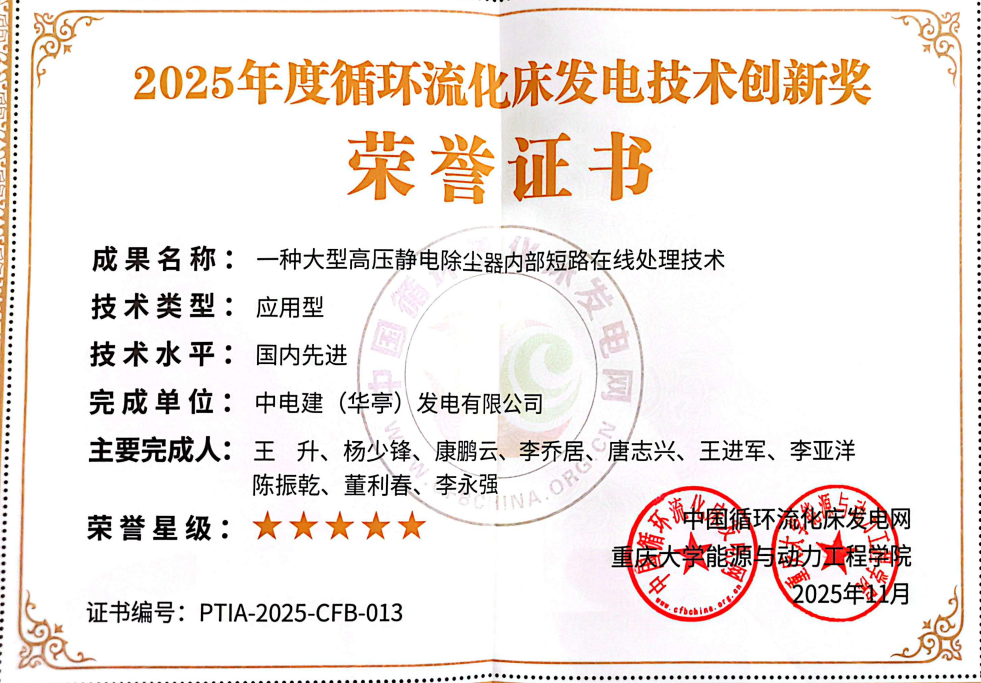 在近日于重庆举办的2025循环流化床发电年会上,华亭发电公司凭借在深度调峰领域的技术突破与卓越实践,荣获《2025年度循环流化床发电技术创新成果奖—深度调峰标杆电厂》5星级称号。这一荣誉充分体现了公司在火电灵活性改造与安全运行方面的行业领先地位,也彰显了公司领导与全体员工持续创新、锐意进取的不懈追求与显著成果。 本届年会由中国循环流化床发电网主办,华亭发电公司申报的《一种大型高压静电除尘器内部短路在线处理技术》和《利用电池储能改善循环流化床锅炉AGC响应及深度调峰安全性的运行策略》两项创新成果,成功斩获“2025年度循环流化床发电5星级技术创新奖”,赢得了与会专家的高度赞誉。 《一种大型高压静电除尘器内部短路在线处理技术》攻克了行业内长期存在的“不停炉状态下电除尘阴极线短路无法处理”难题,为运行中电除尘设备内部阴极故障的在线处理开辟了全新路径。而《利用电池储能改善循环流化床锅炉AGC响应及深度调峰安全性的运行策略》则为早期设计未充分考虑深度调峰需求、负荷响应滞后的循环流化床锅炉机组,提供了一条经济高效且经过工程实践验证的灵活性改造技术方案。 目前,两项应用型技术成果已在华亭发电公司成功落地并取得显著成效。不仅为机组在深度调峰工况下安全、稳定、高效运行提供了坚实的技术支撑,也为设备实现长周期可靠运行打下了牢固基础。同时,该项目在实践中积累了丰富的管理经验与技术资料,为同类型火电机组的设备运维与技术改造提供了宝贵的参考范本。这些成果具有广泛的示范价值和推广前景,充分展现了华亭发电公司在火电技术革新与绿色转型方面的领先实力与创新能力,为企业高质量发展注入了强劲动能。 随着新型电力系统建设的持续推进,新能源装比不断提升,火电机组面临日益严峻的深度调峰运行挑战。为应对这一趋势,华亭发电公司以两台480吨/小时循环流化床(CFB)锅炉机组为研究对象,结合6兆瓦/3兆瓦时锂电池储能系统的工程实践,积极探索储能技术在提升机组调频性能、保障设备安全运行方面的应用潜力。 实际运行数据显示,储能系统凭借其响应速度快、调节精度高的优势,显著提升了机组对自动发电控制(AGC)指令的响应能力,有效缓解了锅炉系统在频繁调峰过程中所承受的热应力冲击。该技术的应用不仅降低了屏式受热面热应力裂纹、返料器耐火材料脱落等安全隐患,还为CFB机组的灵活性改造提供了可靠的技术支撑。 该项目的成功实施,标志着华亭发电公司在火电灵活性改造与储能融合应用领域迈出了坚实一步,为构建清洁低碳、安全高效的新型电力系统贡献了实践经验。 | |
