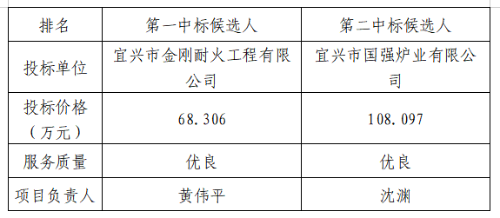 中电建甘肃能源华亭发电有限责任公司#2炉返料器浇注料修复工程于2023年2月27日在甘肃华亭进行公开招标,评标委员会按照规定程序进行开标、评标,现就本次招标的中标候选人公示如下: 一、项目简要说明 中电建甘肃能源华亭发电有限责任公司#2炉返料器浇注料修复工程,主要内容包括但不限于#2炉返料器浇注料修复,包括#2炉A、B侧返料器(包括进料立管膨胀节后及返料管膨胀节前)浇注料的设计、供货、拆除、施工及废料清运等工作。 二、公示网站 中电建甘肃能源华亭发电有限责任公司(http://www.htfd.com.cn/) 三、开标信息 开标日期:2023年2月27日 开标、评标地点:甘肃省平凉市华亭市西华镇华亭发电有限责任公司办公楼一楼三会议室 四、评标委员会推荐的中标候选人 五、公示日期 2023年3月1日至2023年3月3日 六、招标人联系信息 联系人:赵女士 联系电话:0933-7786040 邮箱:htfdzhb@163.com 对以上结果有异议的投标人,请在公示期间以书面形式向招标人反馈意见。